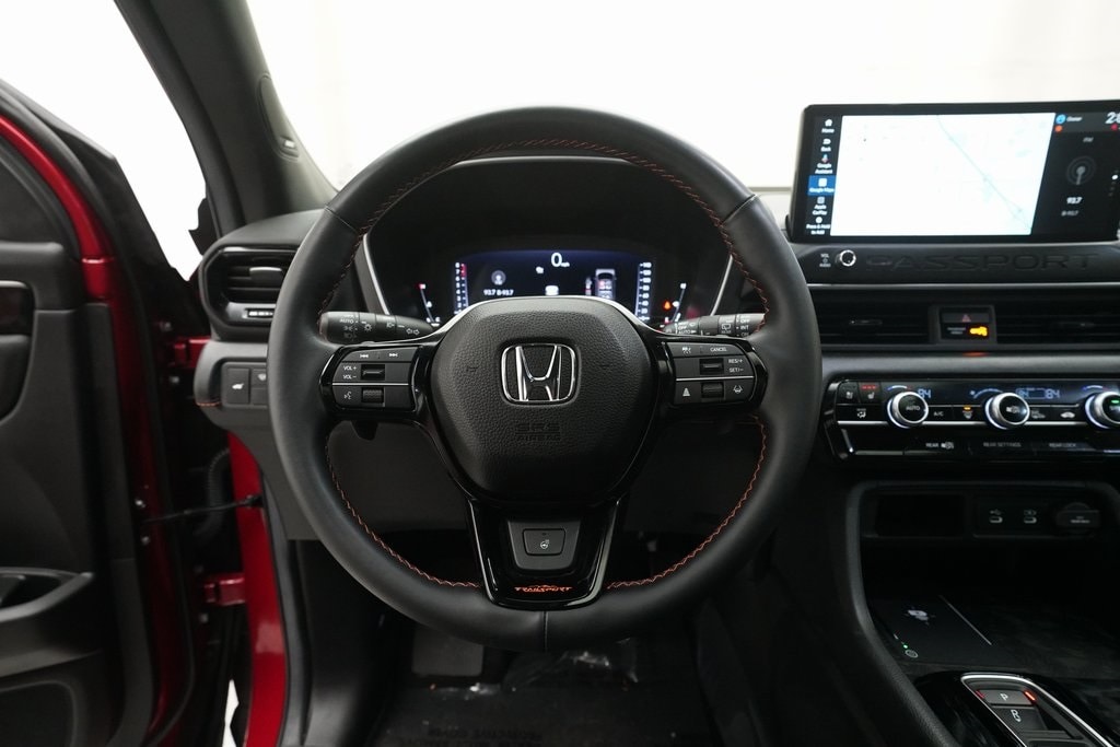 Radiant Red Metallic II TrailSport Elite AWD 10-Speed Automatic 3.5L V6 DOHC 24V **BLUETOOTH**, **REAR VIEW CAMERA**, **BLINDSPOT DETECTION**, **ADAPTIVE CRUISE CONTROL**, **LEATHER**, **HEATED/COOLED SEATS**, **HEATED REAR SEATS**, **HEATED STEERING WHEEL**, **SUNROOF/MOONROOF**, **PANORAMIC ROOF**, **LANE KEEPING ASSIST**, **REAR PARK ASSIST**, **APPLE CAR PLAY/ANDROID AUTO**, **ROAD DEPARTURE ALERT**, **POWER LIFT GATE**, Passport TrailSport Elite, 4D Sport Utility, 3.5L V6 DOHC 24V, 10-Speed Automatic, AWD, Radiant Red Metallic II, Black w/Perforated Leather Seat Trim, 12 Speakers, 4-Wheel Disc Brakes, ABS Brakes, Adaptive Cruise Control: Adaptive Cruise Control (ACC) with Low-Speed Follow, Air Conditioning, Alloy wheels, Apple CarPlay/Android Auto, Auto High-beam Headlights, Auto-dimming door mirrors, Auto-dimming Rear-View mirror, Automatic temperature control, Blind Spot Information (BSI) System warning, Brake Assist, Compass, Delay-off headlights, Driver door bin, Driver vanity mirror, Driver's Seat Mounted Armrest, Dual front impact airbags, Dual front side impact airbags, Dual-Climate Control, Electronic Stability Control, Emergency communication system: HondaLink, Four wheel independent suspension, Front anti-roll bar, Front Bucket Seats, Front Center Armrest, Front Fog Lights, Front reading lights, Fully Automatic Headlights, Heated Front Seats, Heated Rear Seats, Heated Sideview Mirrors, Heated Steering Wheel, HVAC memory, Illuminated Entry, Knee airbag, Lane departure: Lane Keeping Assist System (LKAS) active, Leather steering wheel, Low tire pressure warning, Memory seat, Navigation system: Google Maps, Occupant sensing airbag, Outside Temperature Display, Overhead airbag, Overhead Console, Panic Alarm, Passenger door bin, Passenger seat mounted armrest, Passenger vanity mirror, Perforated Leather Seat Trim, Power Adjusting Driver Seat, Power Liftgate, Power Moonroof, Power passenger seat, Power Sideview Mirrors, Power Steering, Power Windows, Radio data system, Rain Sensing Wipers, Rear air conditioning, Rear anti-roll bar, Rear reading lights, Rear seat center armrest, Rear Spoiler, Rear Window Wiper, Rear-View Camera, Rear/Front Window Defroster, Remote Keyless Entry, Security System, Speed Control, Speed-Sensing Steering, Split Folding Rear Seat, Steering Wheel Mounted Controls, Tachometer, Telescoping steering wheel, Tilt steering wheel, Traction Control, Trip computer, Turn signal indicator mirrors, Variably intermittent wipers, Ventilated front seats, Wheels: 18" Berlina Black Machine Face Alloy, Passport TrailSport Elite, 4D Sport Utility, 3.5L V6 DOHC 24V, 10-Speed Automatic, AWD, Radiant Red Metallic II, Black w/Perforated Leather Seat Trim. CARFAX One-Owner. Clean CARFAX. Certified.